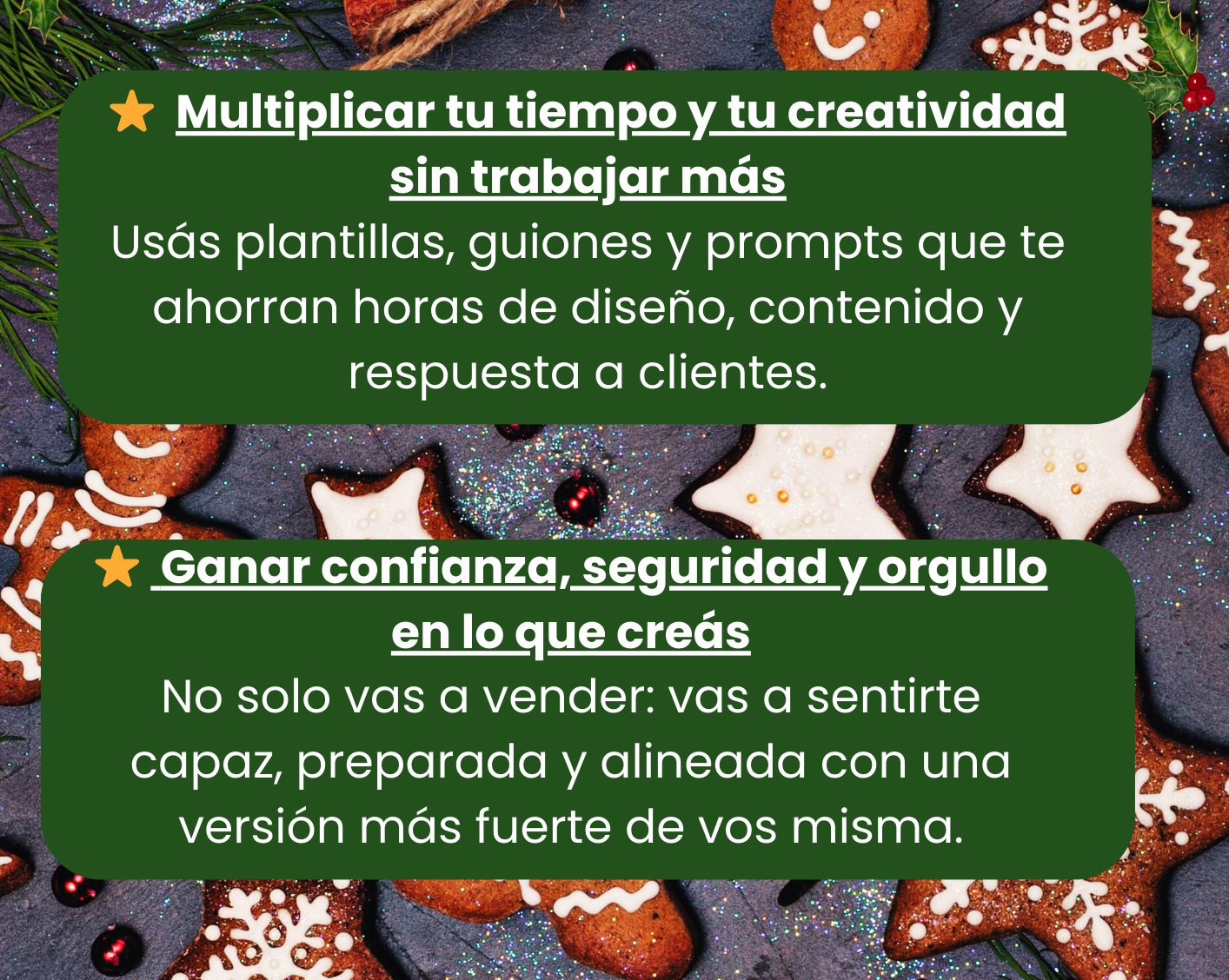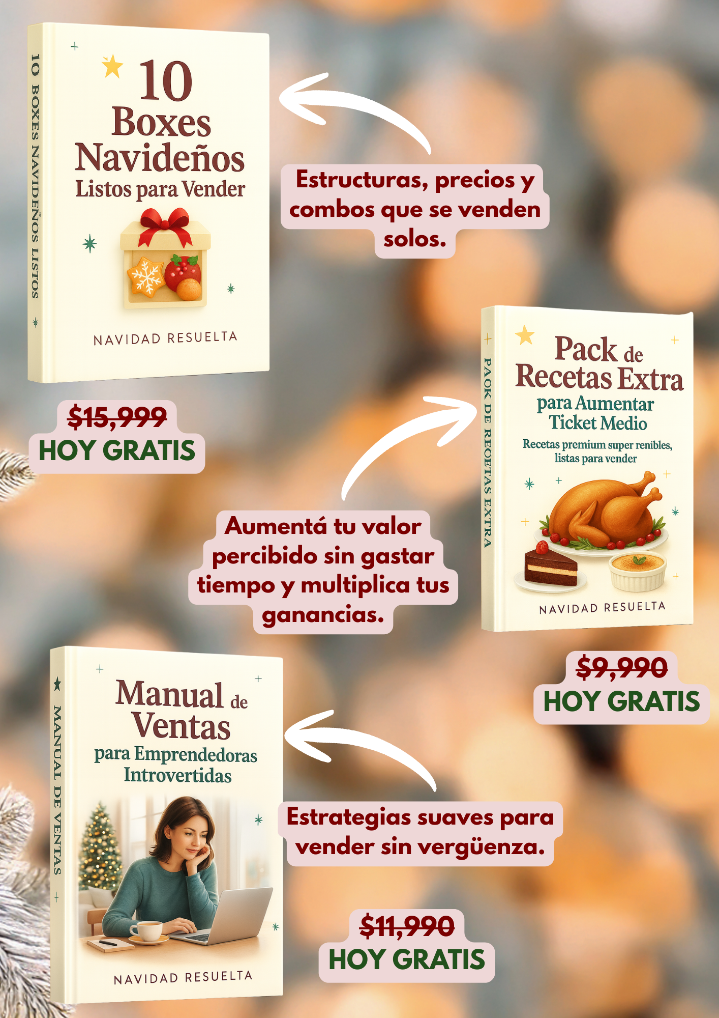Recetas, estrategias de venta, 10 boxes listos, 40 mensajes automáticos, plantillas de publicaciones e historias, precios sugeridos, un manual para introvertidas y un bono con más de 50 prompts premium para ChatGPT.